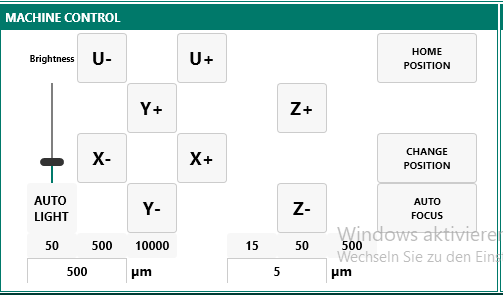Der Bereich Machine Control dient zur manuellen Steuerung des XY-Tisches sowie der Z-Achse für die Fokussierung. Für Bewegungen in X- und Y-Richtung stehen vordefinierte Schrittgrößen von 50, 500 und 10.000 µm zur Verfügung. Für die Fokusanpassung entlang der Z-Achse können Schrittgrößen von 15, 50 oder 500 µm gewählt werden.