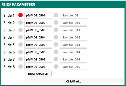 Im Bereich Slide Parameters werden die zu messenden Proben definiert. Geben Sie hierzu für jede belegte Position eine eindeutige Sample ID ein. Nur Positionen mit eingetragener Sample ID werden in die Messung einbezogen, leere Positionen werden übersprungen.