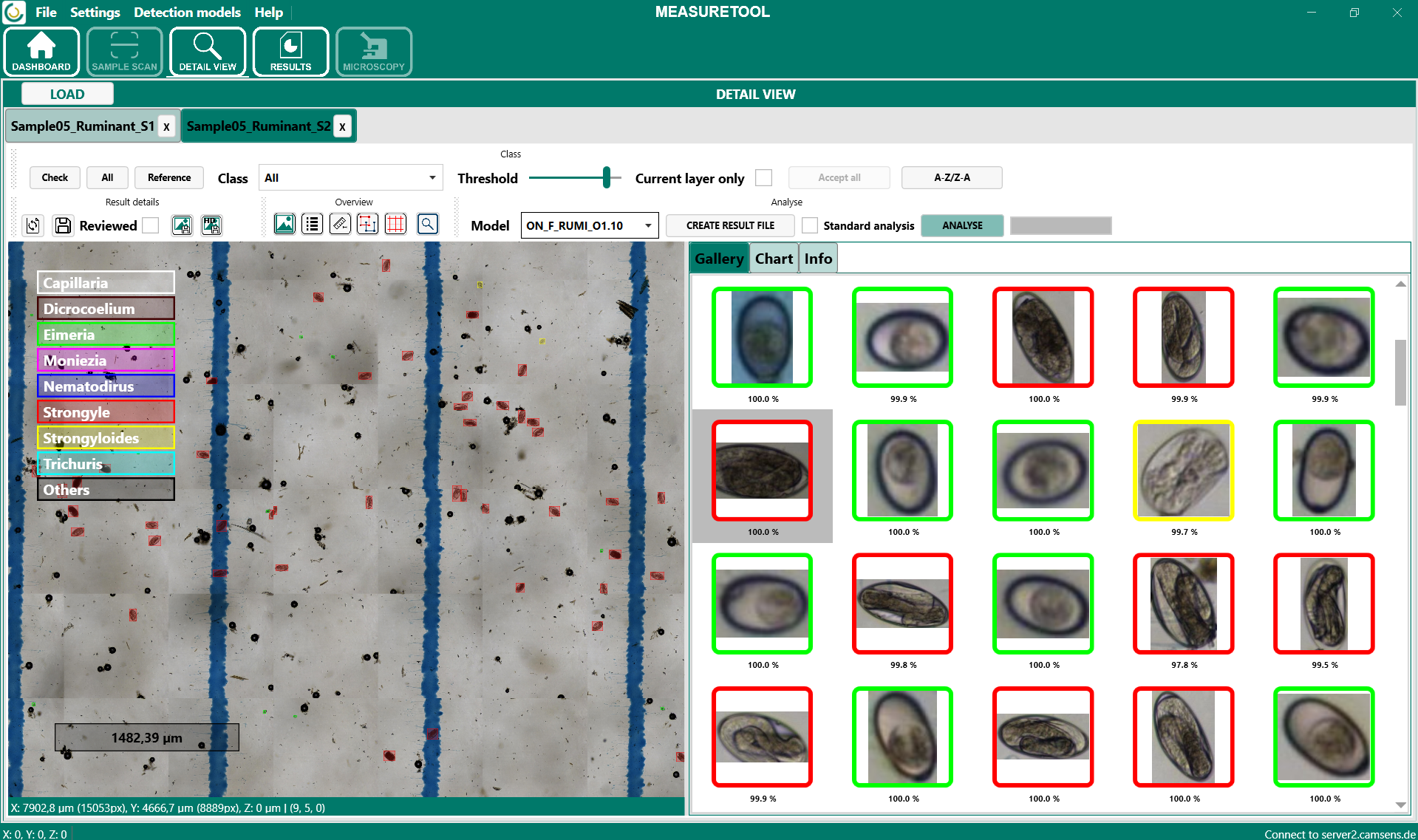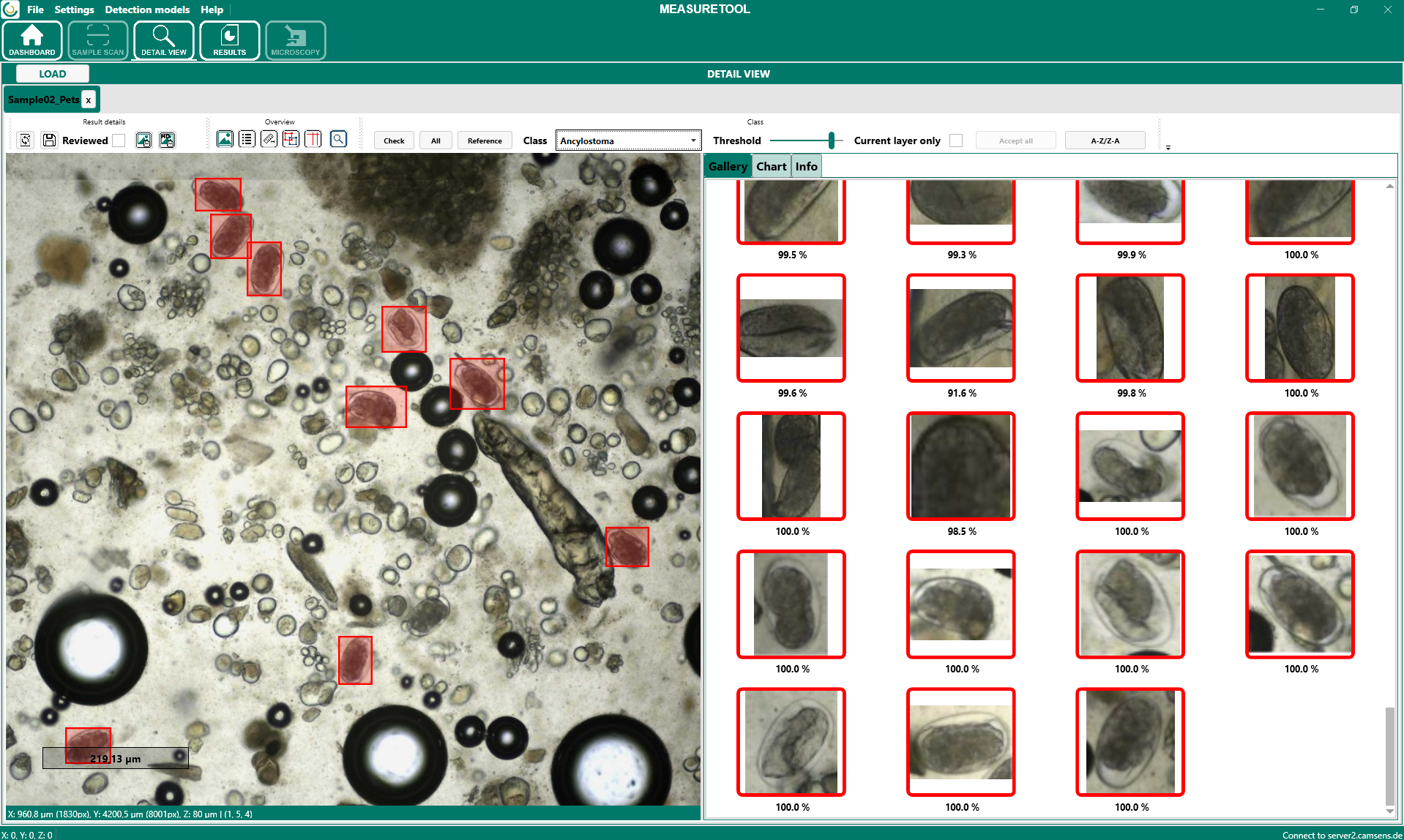 Im Bereich Detail View kann eine bereits durchgeführte Messung im Detail geprüft und bearbeitet werden. Hier stehen die Register Gallery, Chart und Info zur Verfügung. Dadurch können sowohl die erkannten Objekte als auch die zugehörigen Ergebnis- und Scaninformationen strukturiert überprüft werden.
