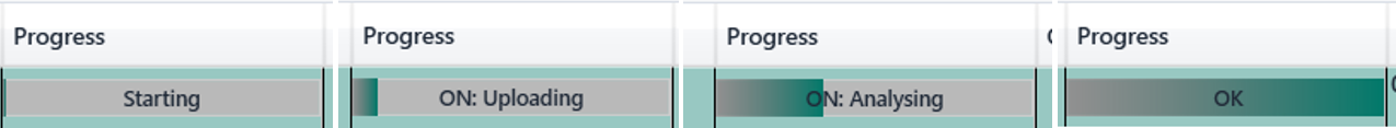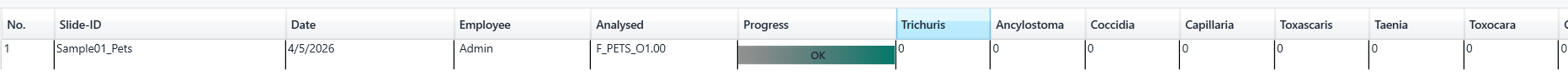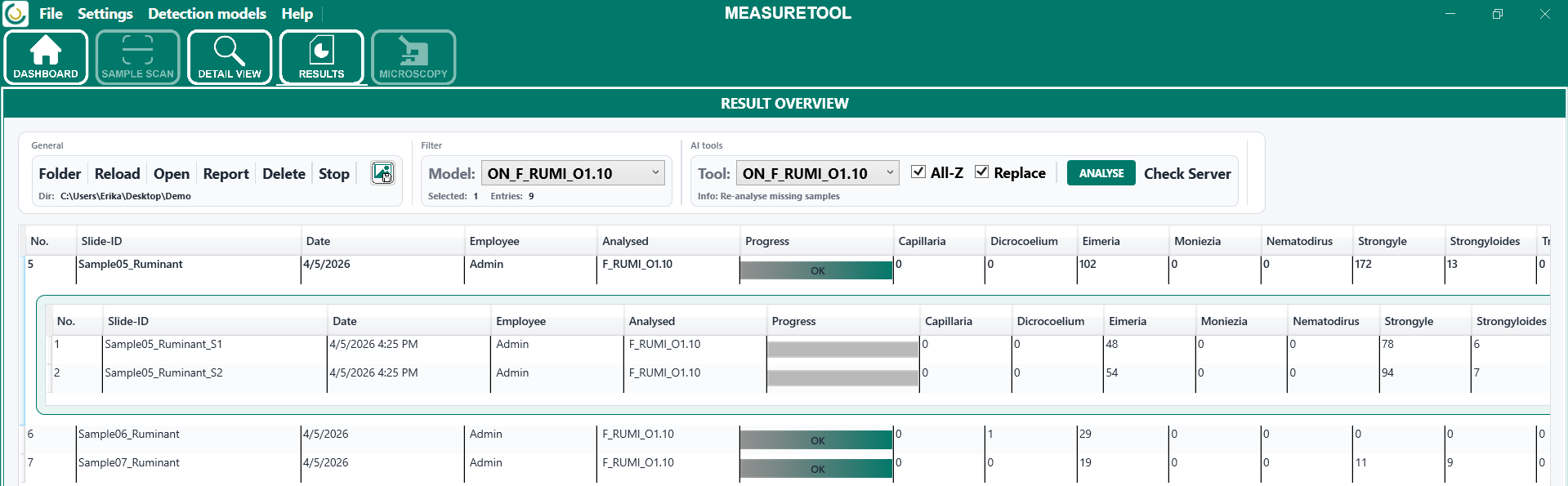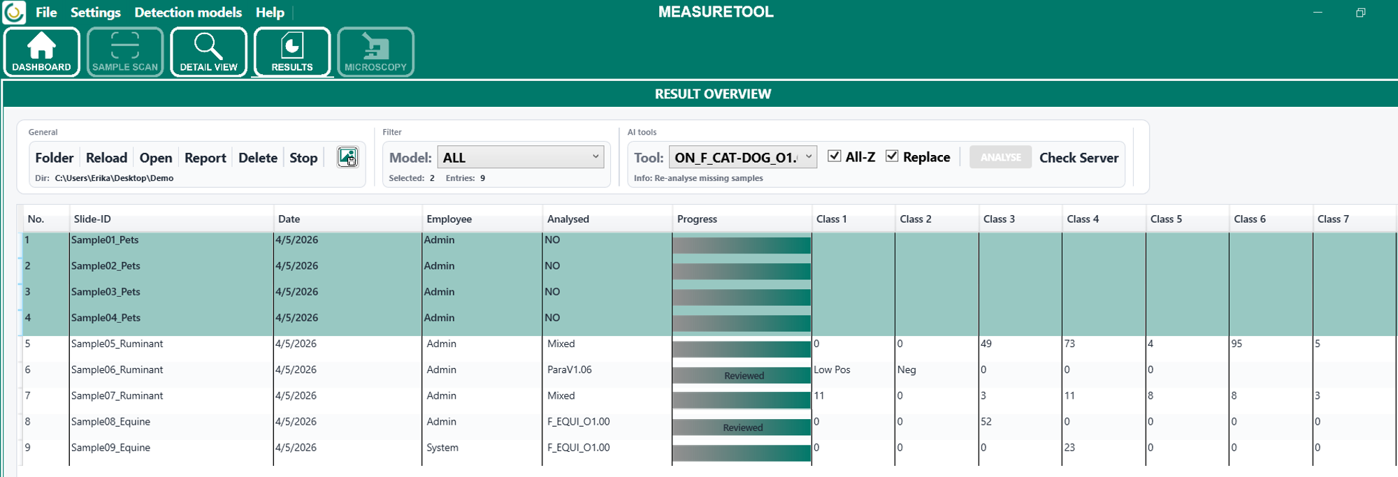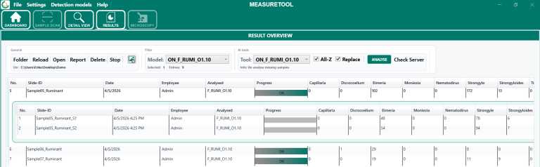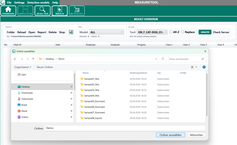 Die Ergebnisübersicht dient der zentralen Verwaltung und Kontrolle bereits durchgeführter Messungen. Nach dem Laden des Ergebnisordners werden die enthaltenen Messungen im Bereich Results in tabellarischer Form angezeigt. Die Übersicht enthält unter anderem die Slide-ID beziehungsweise Probenbezeichnung, das Messdatum, den zugehörigen Benutzer, das für die Auswertung verwendete Analysemodell sowie den jeweiligen Bearbeitungsstatus. Im Bereich Progress wird zusätzlich angezeigt, ob eine Probe bereits analysiert, überprüft oder erneut ausgewertet wurde.
