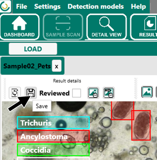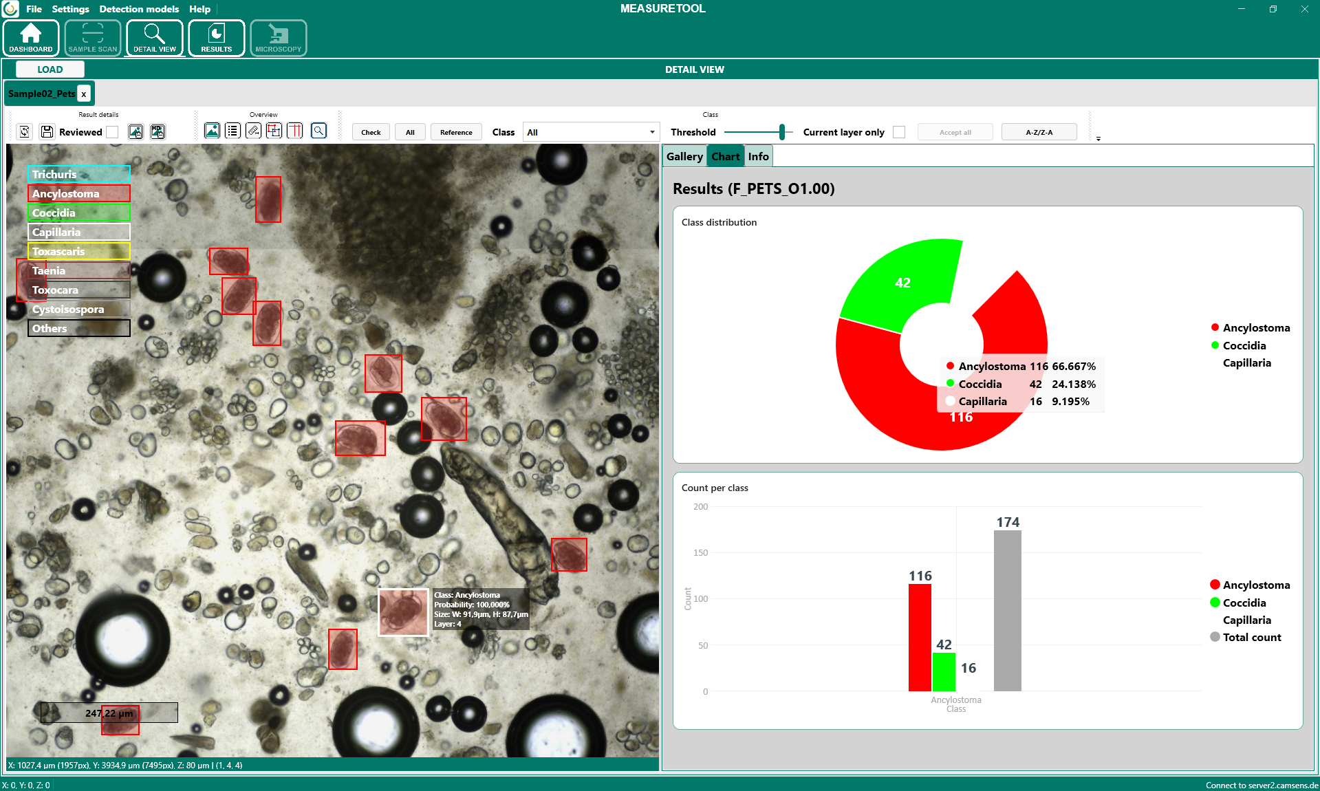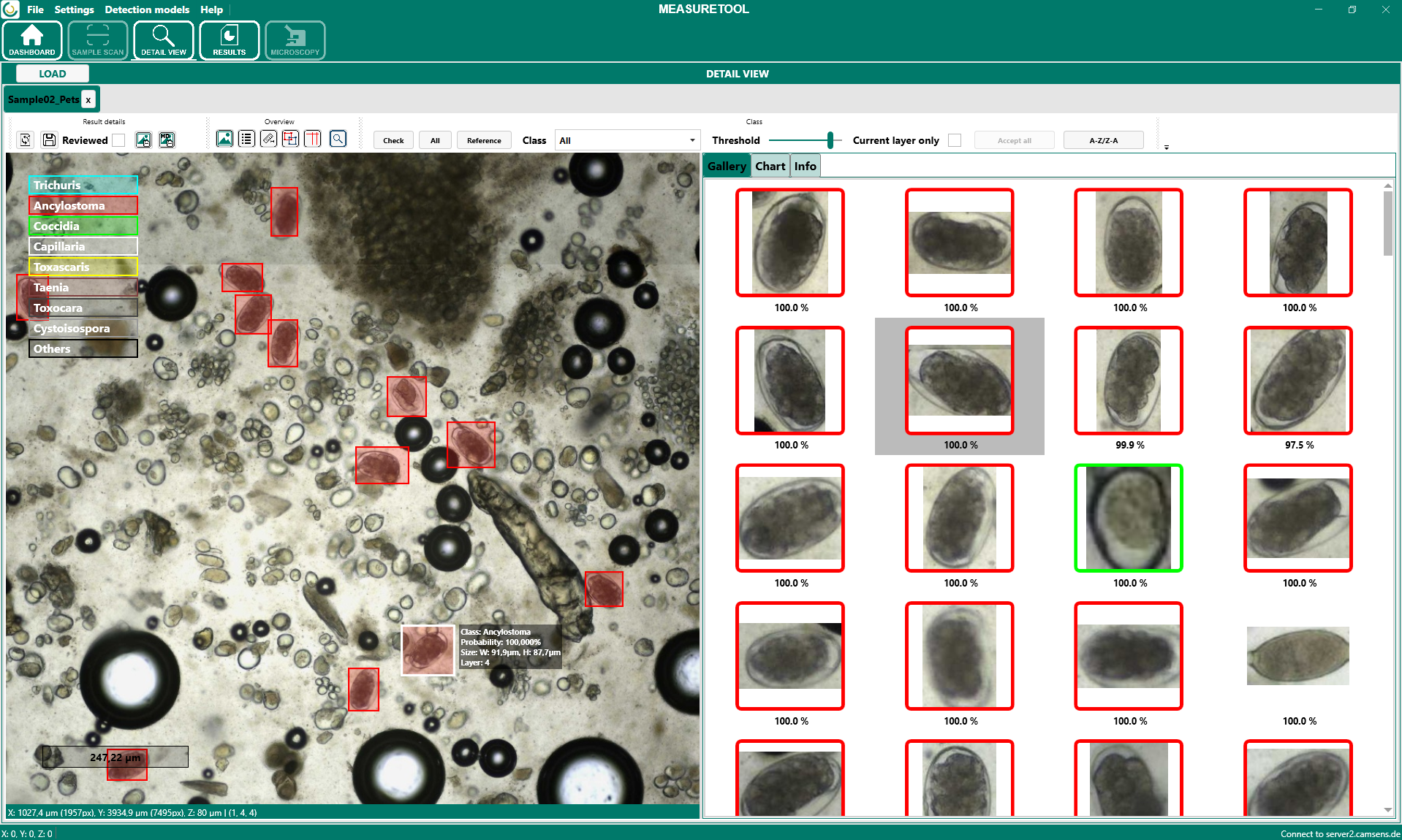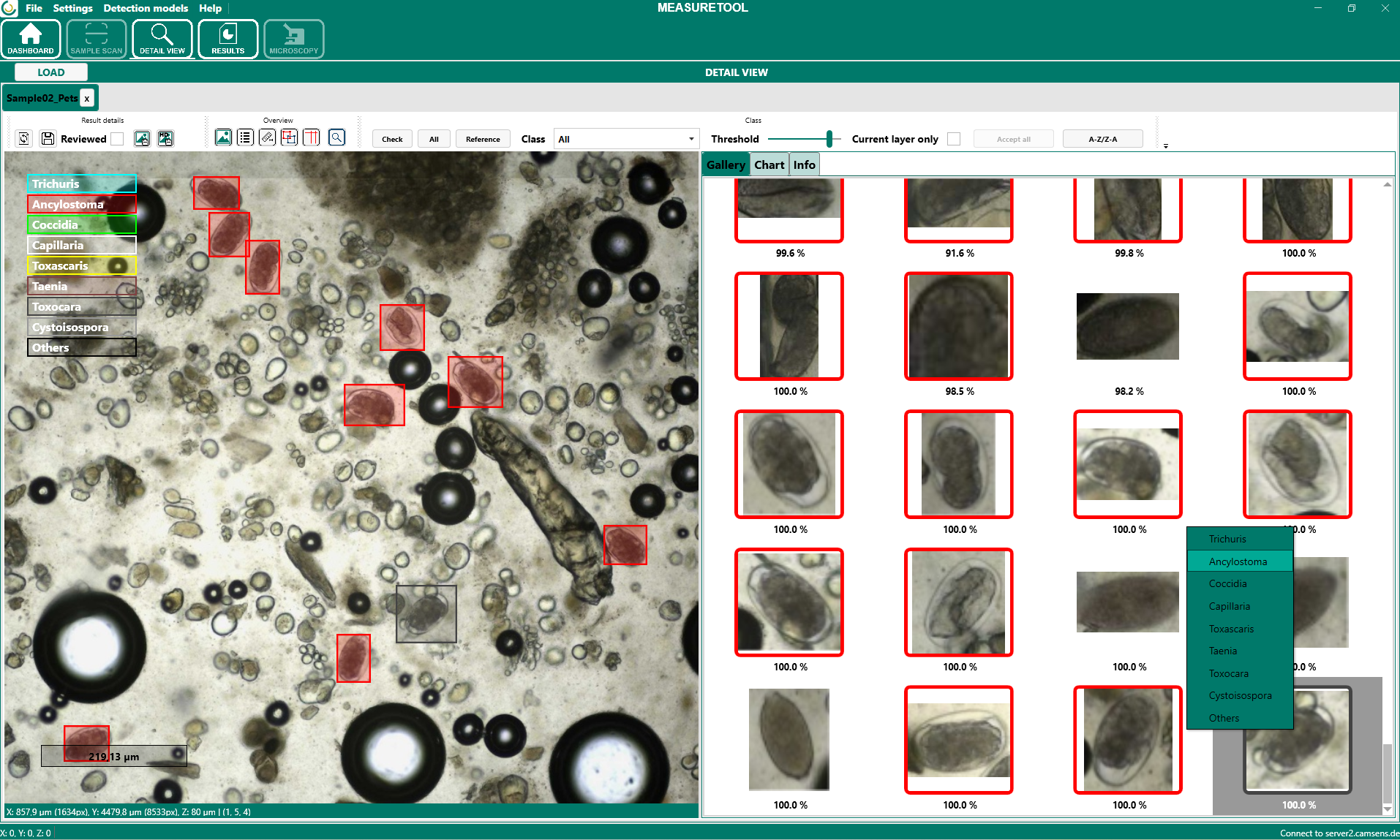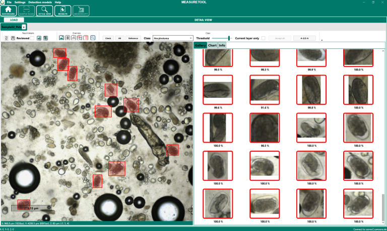 Durch einen Doppelklick auf ein Objekt in der Galerie wird dessen Position im Gesamtbild angezeigt. Dadurch kann das Objekt direkt im Zusammenhang mit der gesamten Probe überprüft werden. Mit einem Rechtsklick auf ein Objekt kann die Klassenzuweisung angepasst werden. Falls ein Objekt fälschlicherweise erkannt wurde, kann es ausgewählt und gelöscht werden. Auf diese Weise lassen sich falsch positive Ergebnisse entfernen und bestehende Ergebnisse gezielt korrigieren.