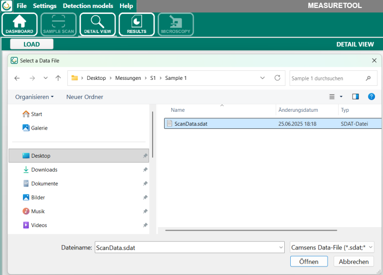 Über den Bereich Detail View können bereits durchgeführte Messungen geladen und im Detail geprüft werden. Eine Messung kann entweder direkt aus dem Bereich Results übernommen oder über die Schaltfläche Load durch Auswahl der Datei ScanData.sdat geöffnet werden.