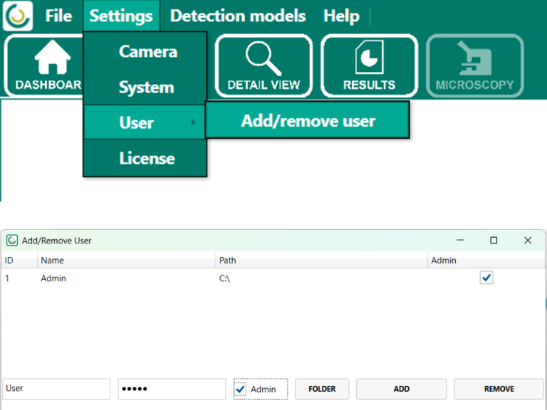 Zum Anlegen eines neuen Benutzers öffnen Sie im oberen Menü den Punkt Settings und wählen User aus. Im daraufhin geöffneten Fenster Add/Remove User können neue Benutzerkonten erstellt und bestehende Benutzer verwaltet werden. Tragen Sie dazu im unteren Bereich den Benutzernamen und das Passwort ein. Bei Bedarf kann dem Benutzer durch Aktivieren der Option Admin Administratorberechtigung zugewiesen werden. Sofern erforderlich, kann über Folder ein Benutzerpfad festgelegt werden. Mit einem Klick auf Add wird der neue Benutzer gespeichert.