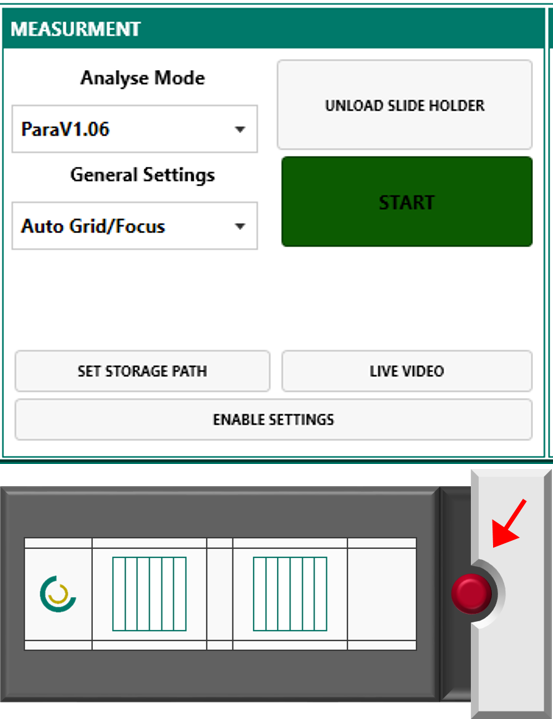 Vor dem Start der Messung ist sicherzustellen, dass der Probenhalter korrekt eingesetzt ist. Sofern erforderlich, ist dabei darauf zu achten, dass der rote Stift ordnungsgemäß eingesetzt ist. Anschließend kann der Probenhalter über die dafür vorgesehene Schaltfläche verfahren werden.