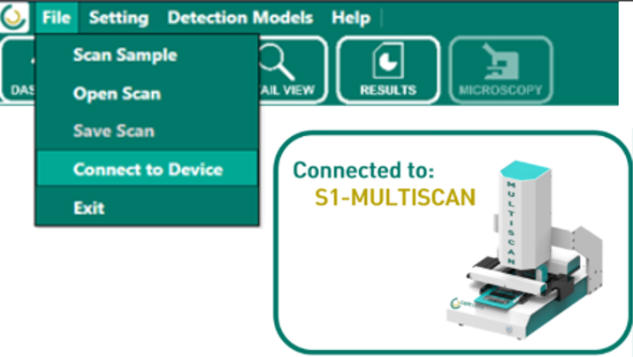 Zum Verbinden des Multiscan-Systems öffnen Sie im oberen Menü File und wählen den Eintrag Connect to Device. Nach erfolgreicher Verbindung wird im Dashboard eine entsprechende Statusmeldung angezeigt. Die Einblendung Connected to: S1-MULTISCAN zeigt an, dass das Gerät korrekt verbunden wurde und betriebsbereit ist.