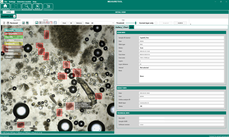 → Im Register Info werden die zugehörigen Scan- und Ergebnisinformationen der geöffneten Probe angezeigt. Dazu gehören unter anderem die Sample ID, der Benutzer, der verwendete Slide Type, Datum und Uhrzeit des Scanvorgangs sowie technische Angaben wie die Anzahl der aufgenommenen Layer und der Layer-Abstand.