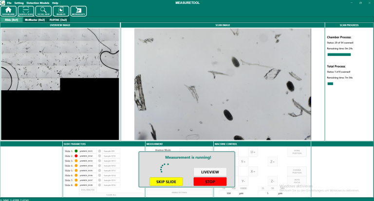 Die Oberfläche des Messbereichs ist in mehrere Funktionsbereiche gegliedert. Dazu gehören Slide Parameters, Measurement, Machine Control, Scan Image und Scan Progress. Diese Bereiche dienen der Einrichtung, Durchführung und Überwachung der Messung.